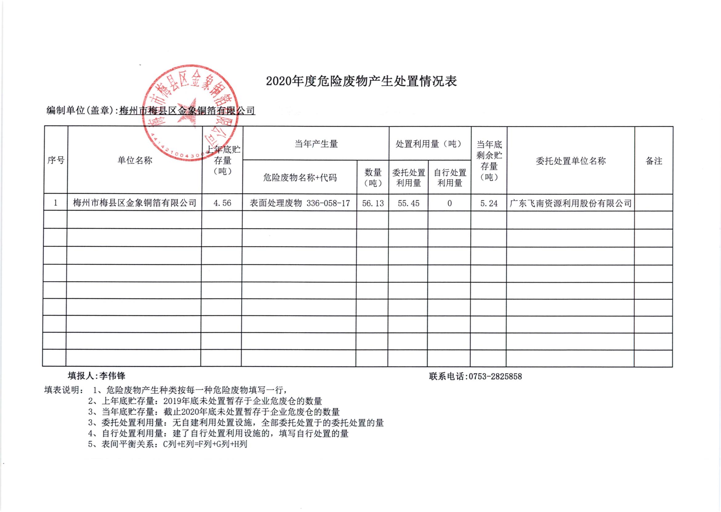 梅州市梅县区金象铜箔有限公司2020年度固体废物污染环境防治信息公示