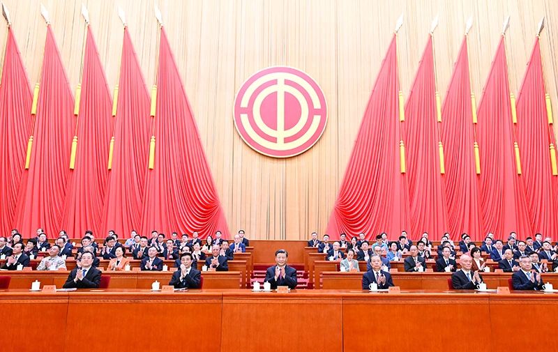 10月9日,中国工会第十八次全国代表大会在北京人民大会堂开幕。习近平、赵乐际、王沪宁、蔡奇、丁薛祥、李希等在主席台就座,祝贺大会召开。新华社记者 申宏 摄