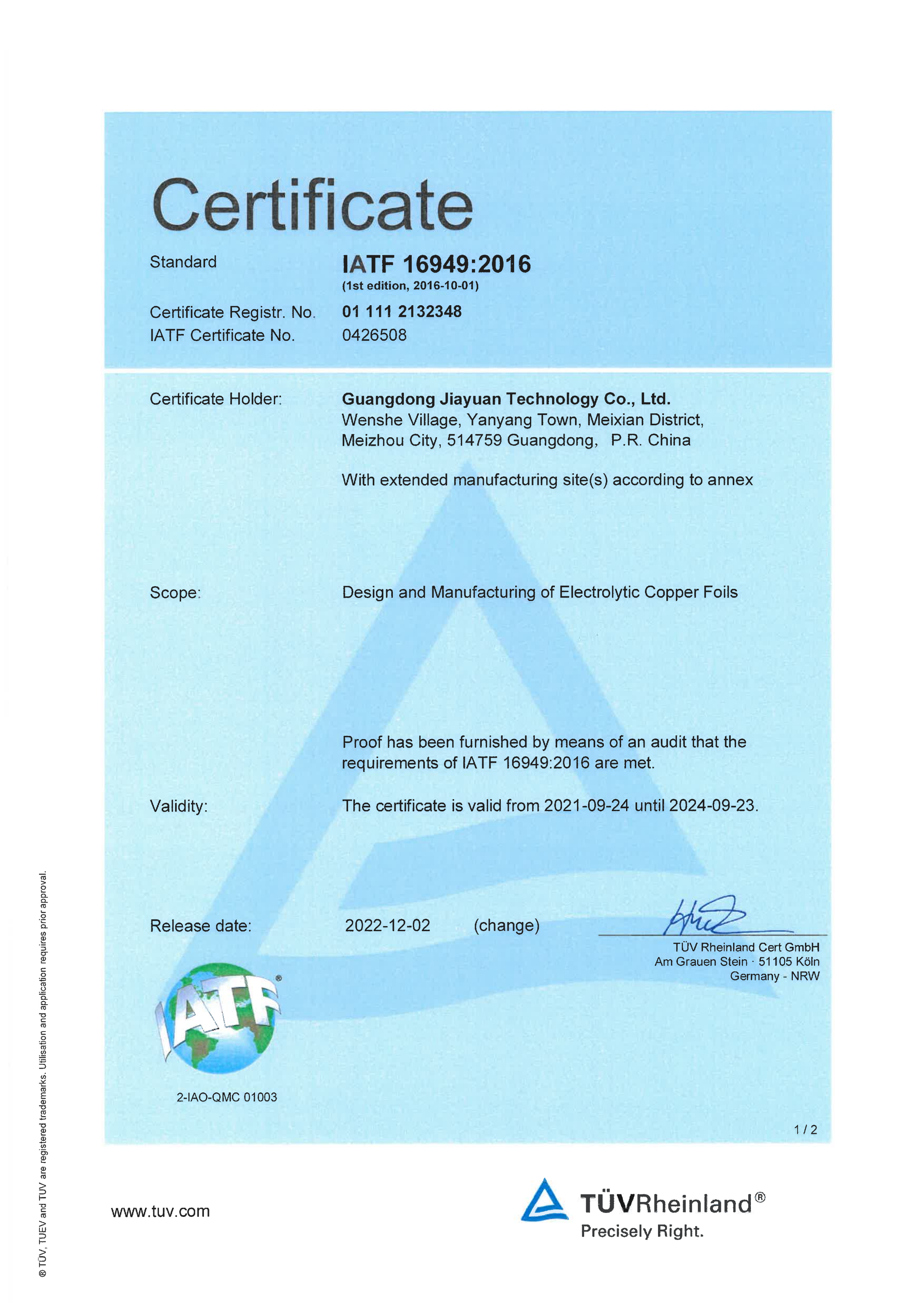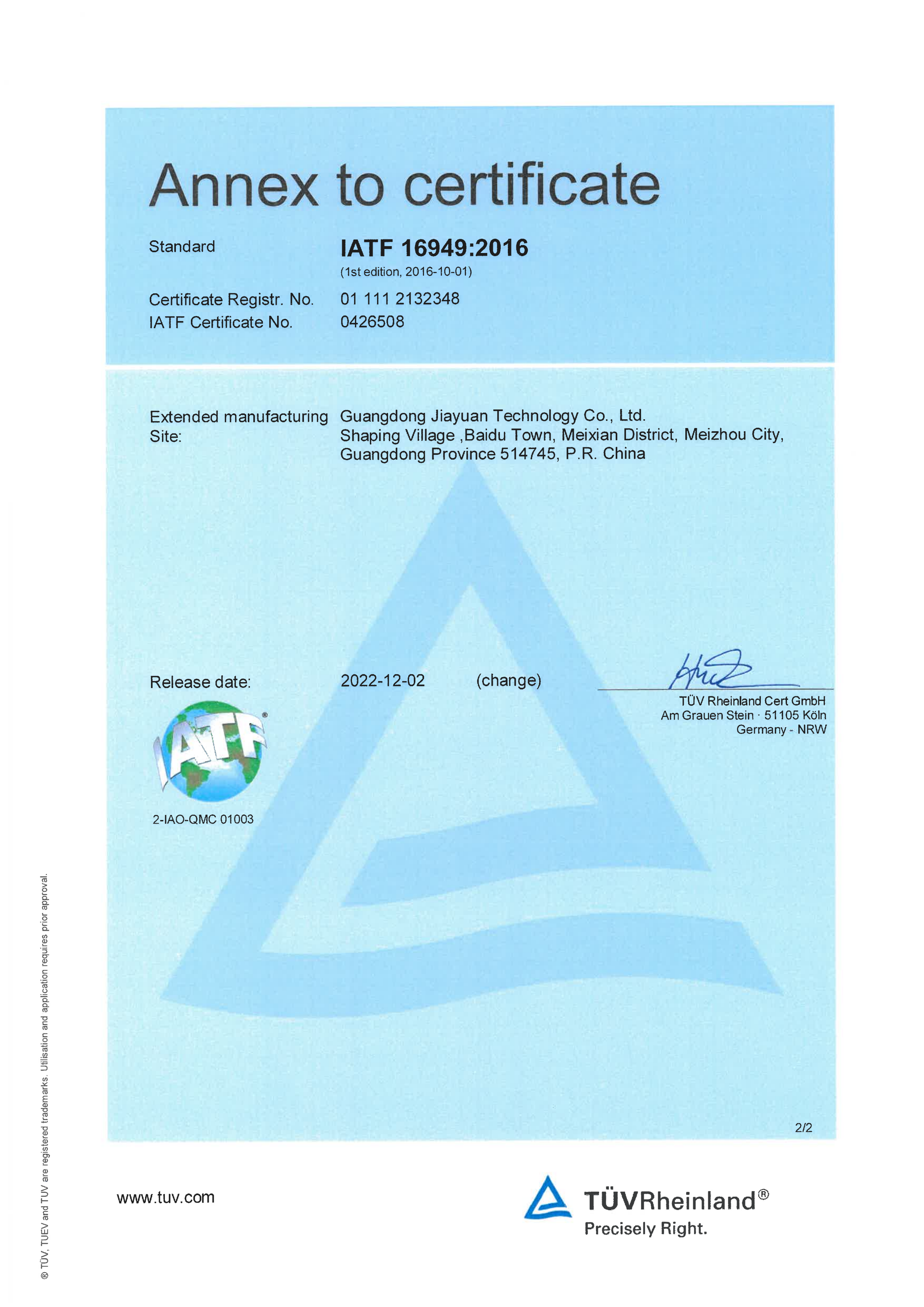 IATF 16949:2016认证证书