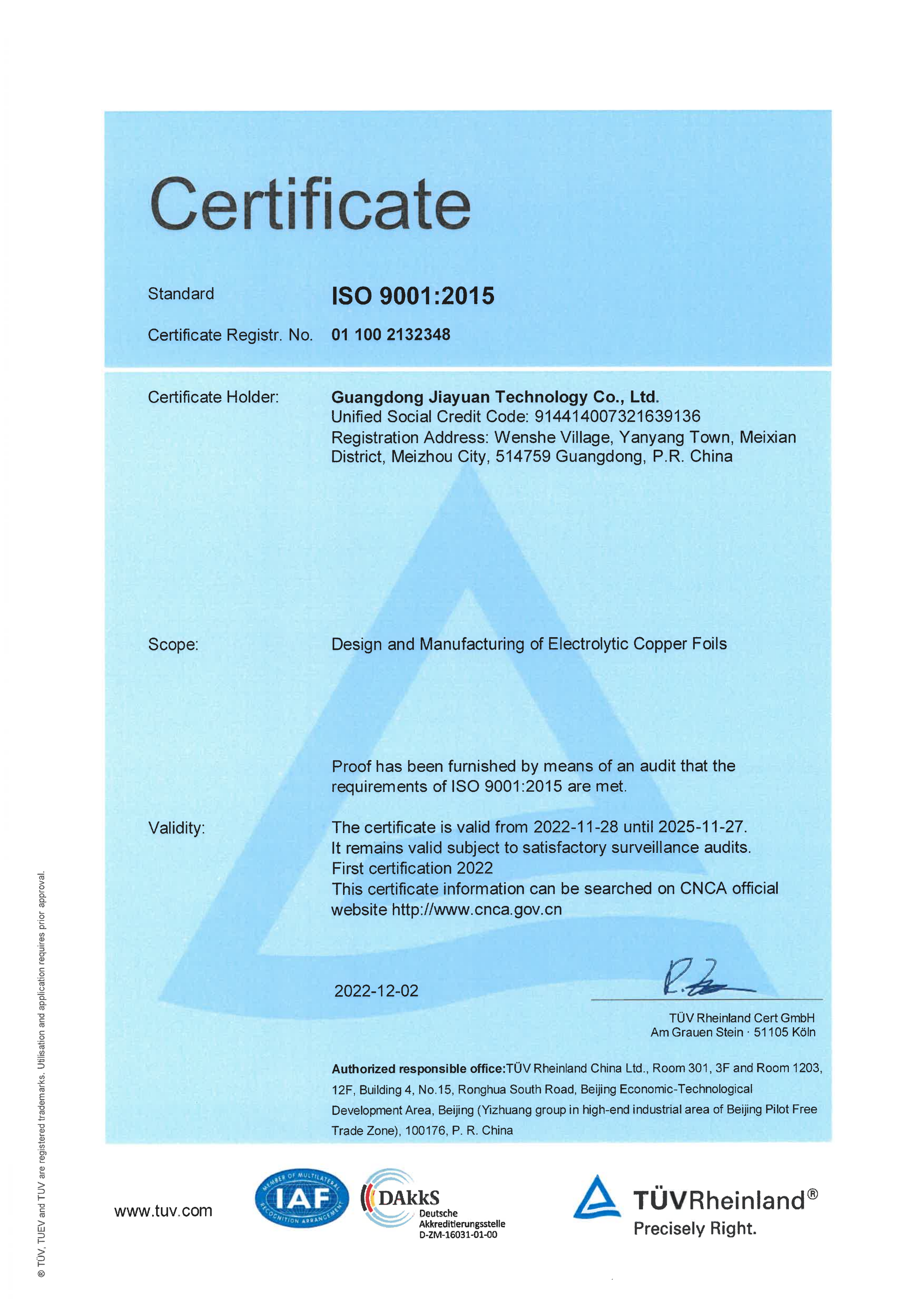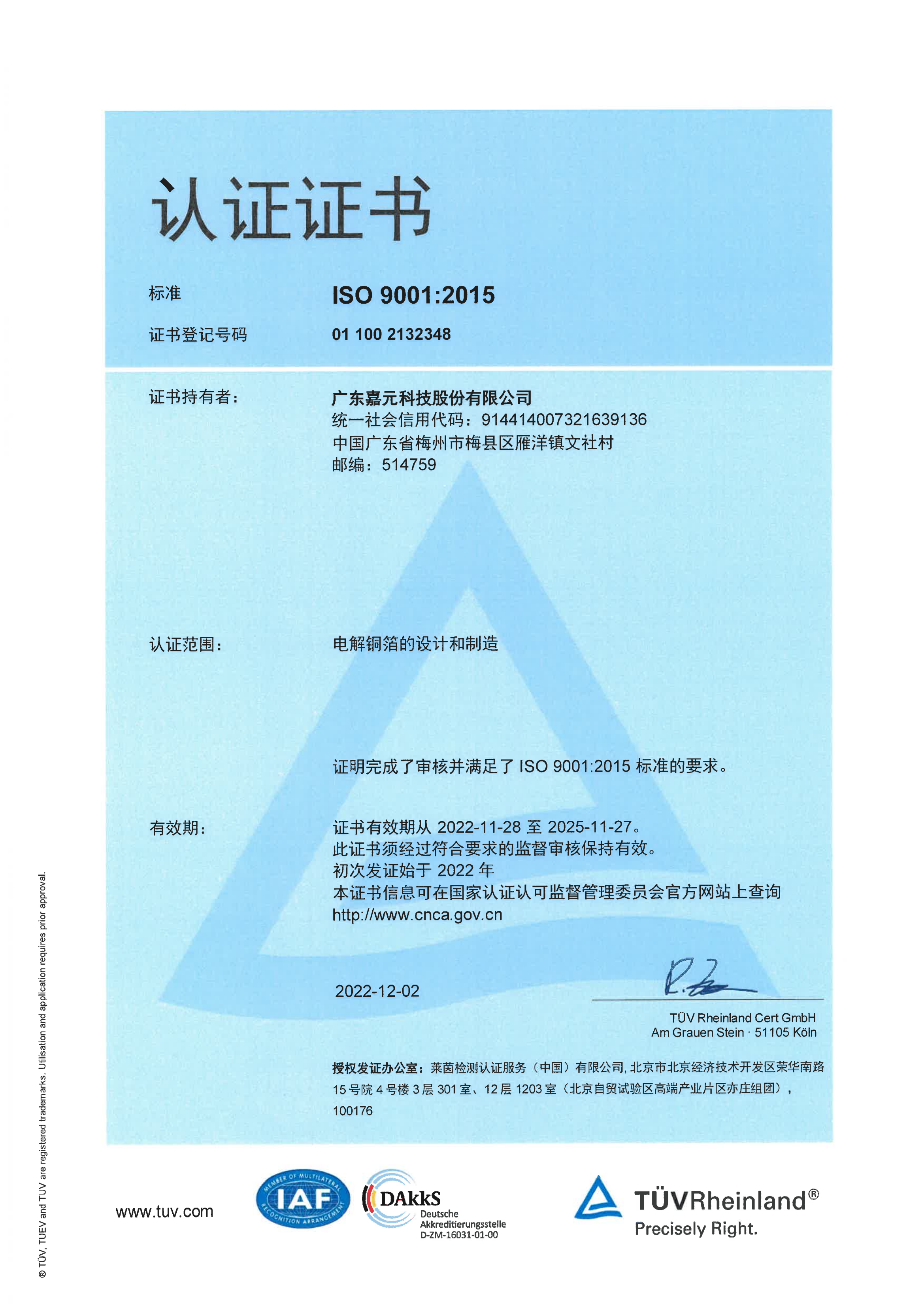 ISO 9001:2015认证证书